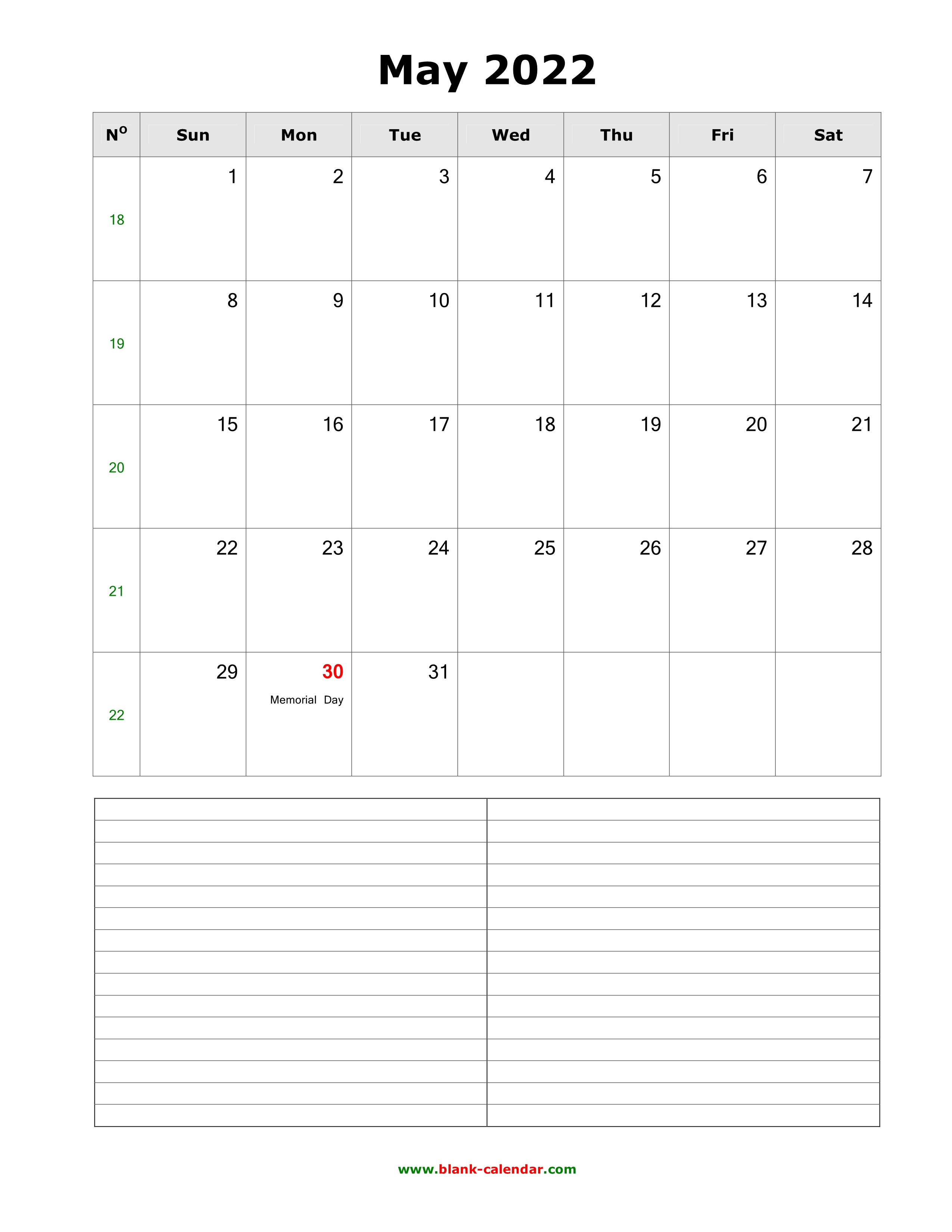 Download May 2022 Blank Calendar with Space for Notes (vertical)