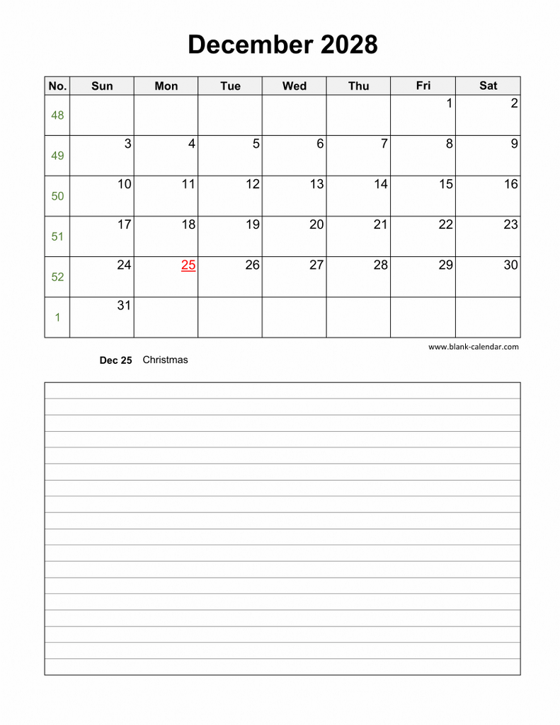 Download December 2028 Blank Calendar with Space for Notes (vertical) Free Download December 2028 Blank Calendar (vertical, space for notes) Version: 2027 - 2028Week starts on Sunday Week starts on Monday Total Downloads: > 1,000 times ➤ December 2028 Calendar » Previous month: November 2028 Blank CalendarRelated December 2028 Blank CalendarDecember 2028 Blank Calendar with US Holidays (horizontal)December 2028 Blank Calendar (horizontal, space for notes)December 2028 Blank Calendar (horizontal)