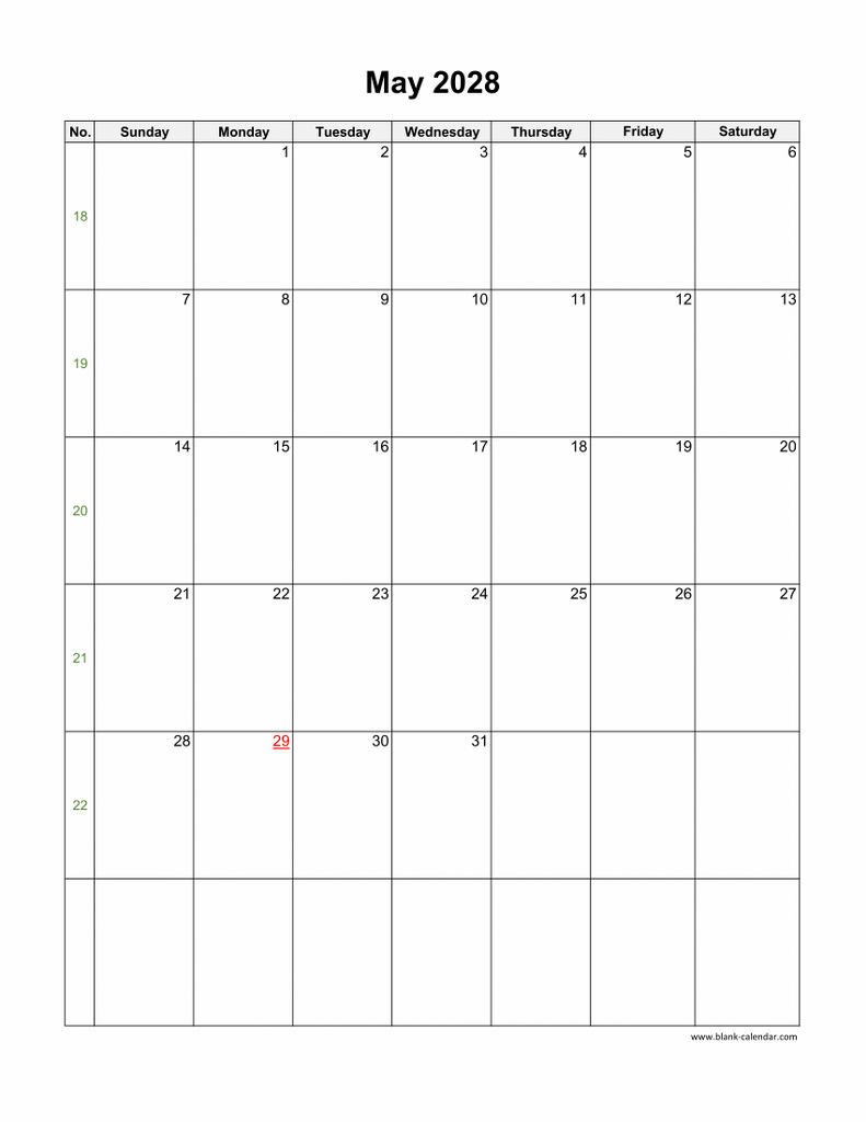 Download May 2028 Blank Calendar (vertical)