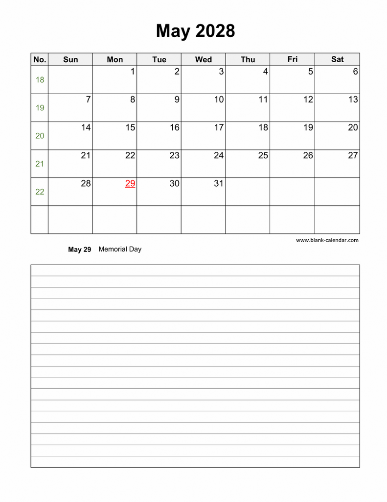 Download May 2028 Blank Calendar with Space for Notes (vertical)