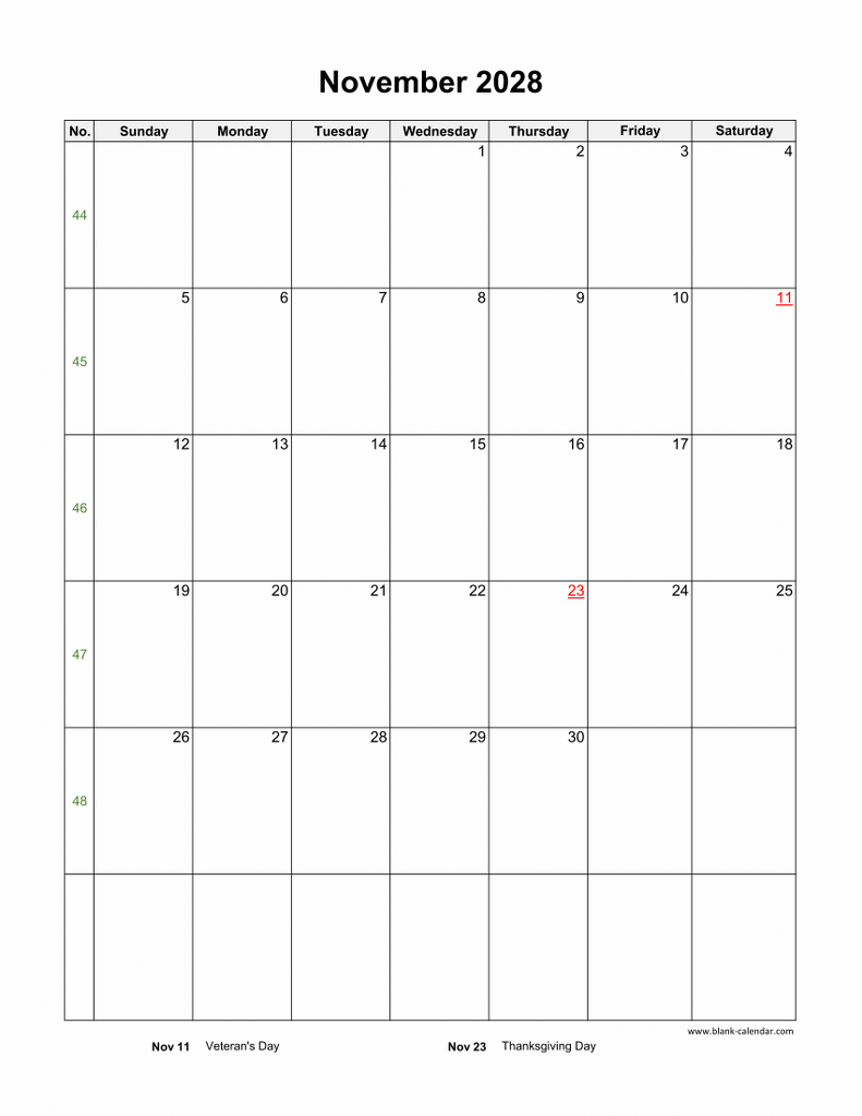 Free Download November 2028 Blank Calendar (US Holidays, vertical)