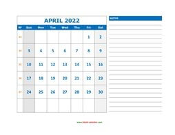 Free Download Printable April 2022 Calendar, large box grid, space for notes (horizontal)