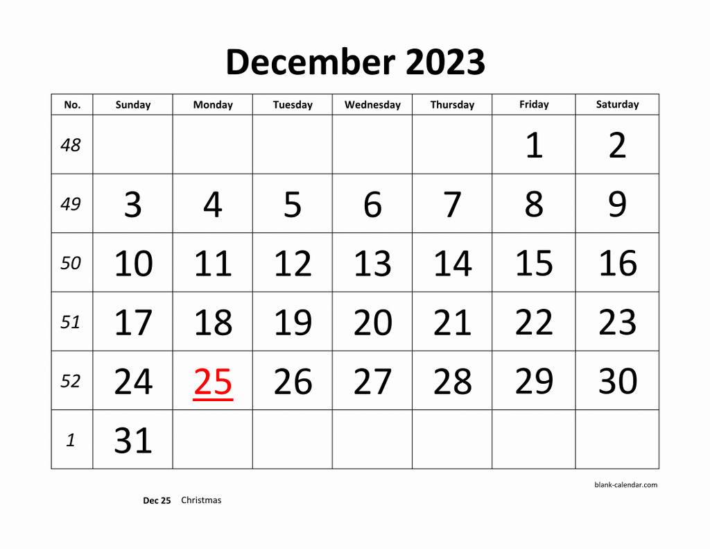Free Download Printable December 2023 Calendar, large font design , holidays on red