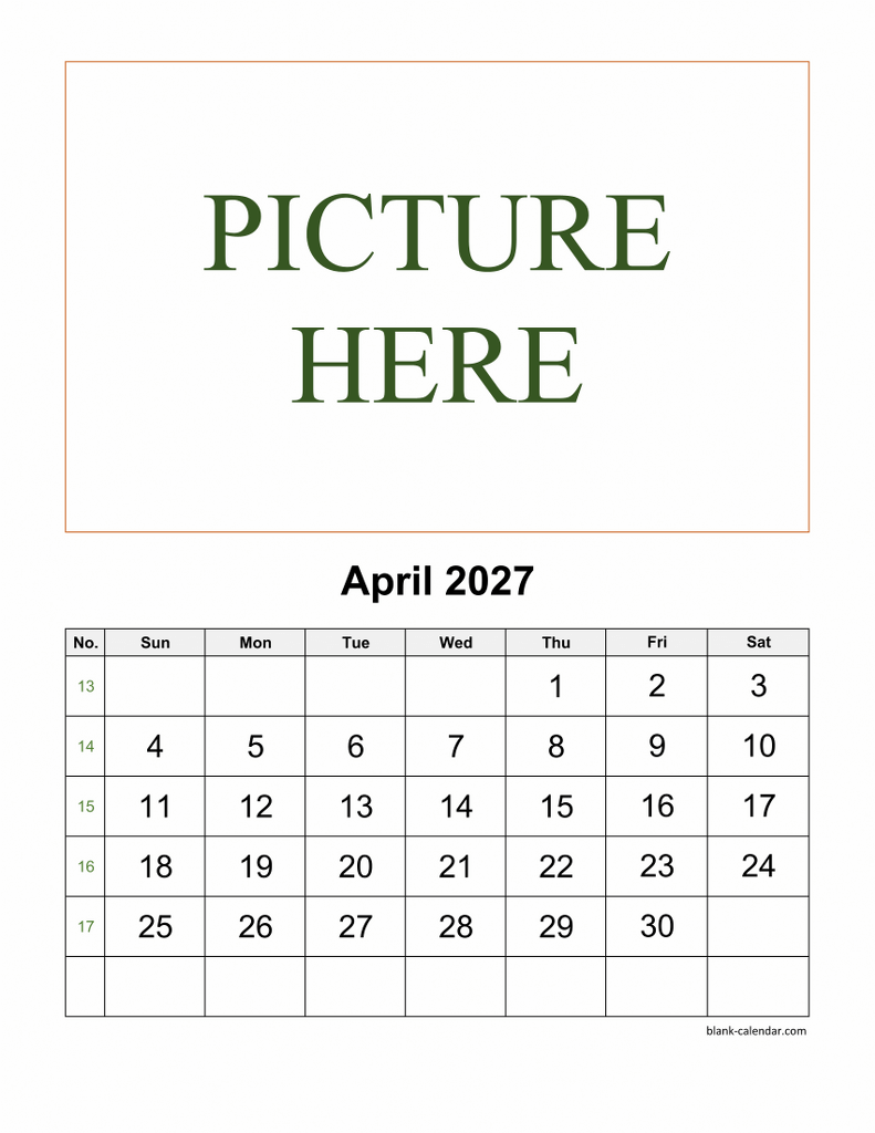 Free Download Printable April 2027 Calendar, pictures can be placed at the top