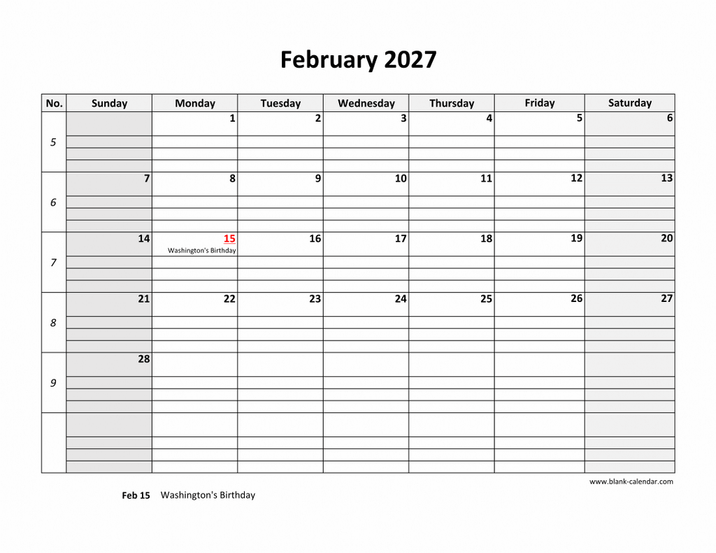 Free Download Printable February 2027 Calendar, large box grid, space for notes (horizontal)