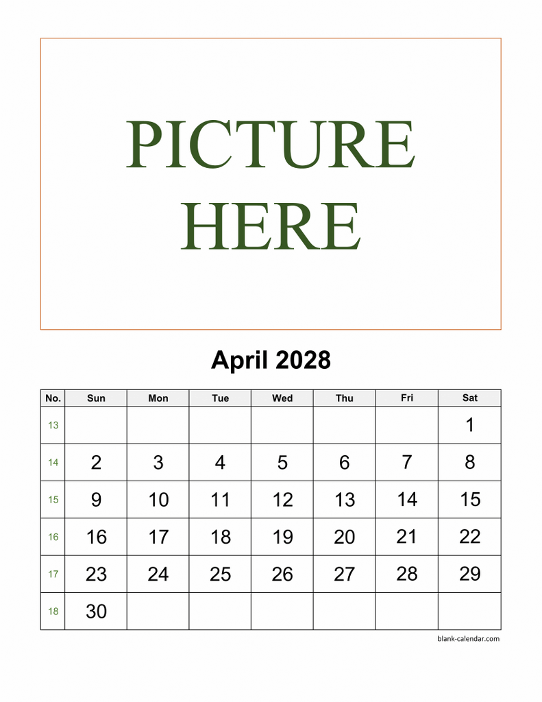 Free Download Printable April 2028 Calendar, pictures can be placed at the top (vertical)