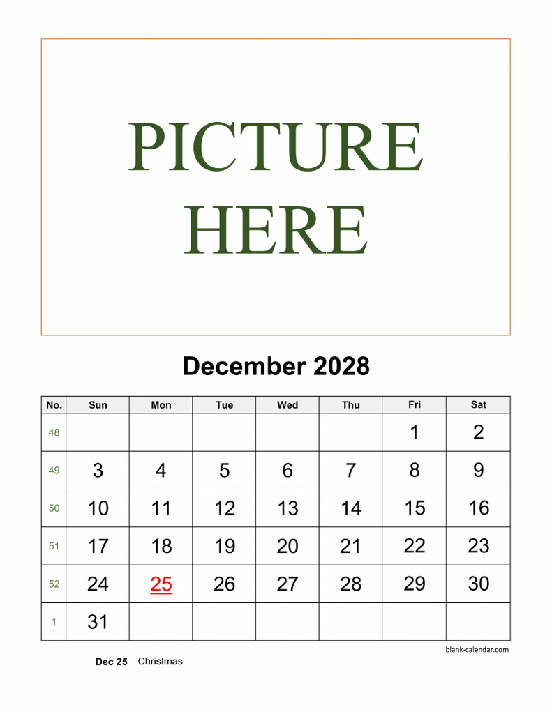 Free Download Printable December 2028 Calendar, pictures can be placed at the top (vertical)