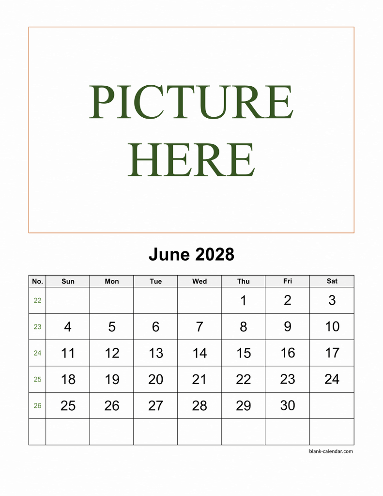 Free Download Printable June 2028 Calendar, pictures can be placed at the top (vertical)