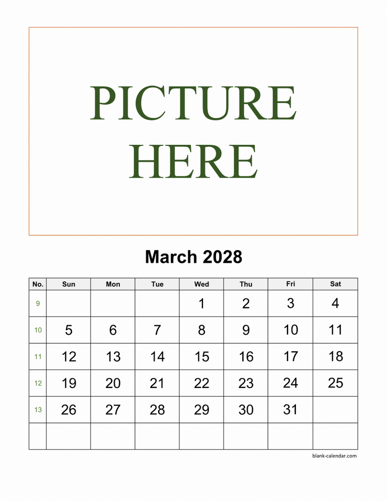 Free Download Printable March 2028 Calendar, pictures can be placed at the top (vertical)