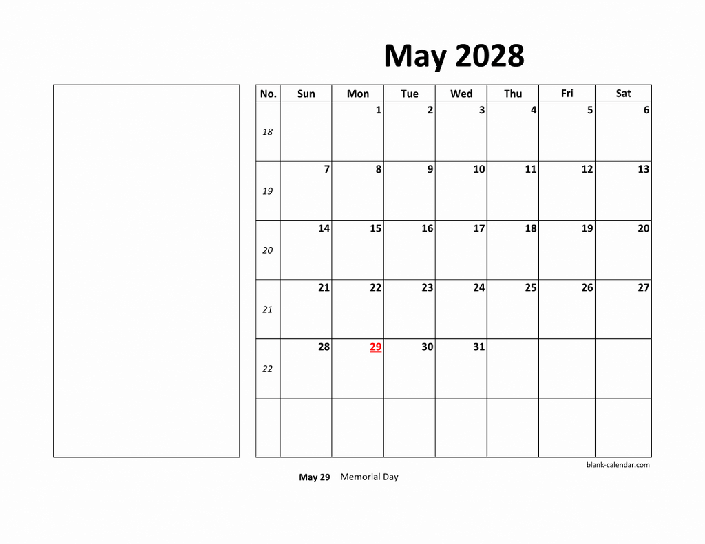 Free Download Printable May 2028 Calendar, large box, Federal Holidays listed, space for notes (horizontal)