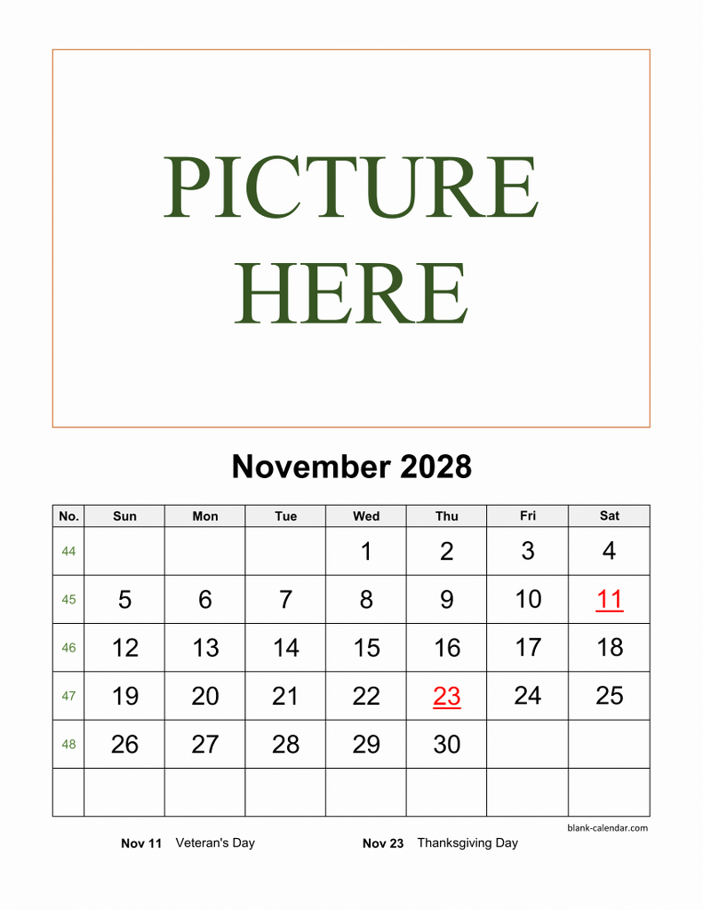 Free Download Printable November 2028 Calendar, pictures can be placed at the top (vertical)