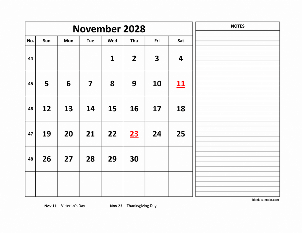 Free Download Printable November 2028 Calendar, large space for appointment and notes (horizontal)