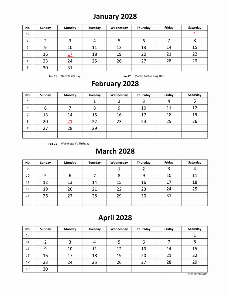 Free Download Printable Calendar 2028, 4 months per page, 3 pages (vertical) Free Download Printable Calendar 2028, 4 months per page, 3 pages (vertical) Version: 2027 - 2028Week starts on Sunday Week starts on Monday Total Downloads: > 1,000 times ➤ See All Printable 2028 Calendars Related Printable 2028 CalendarsPrintable Calendar 2028, pictures can be placed at the topPrintable Calendar 2028, large box, Federal Holidays listed, space for notes (12 pages, horizontal)Printable Calendar 2028, 3 months per page, 4 pages (vertical)Printable Calendar 2028 with check boxes (12 pages, one month per page, horizontal)Printable Calendar 2028, 2 months per page, 6 pages (vertical)