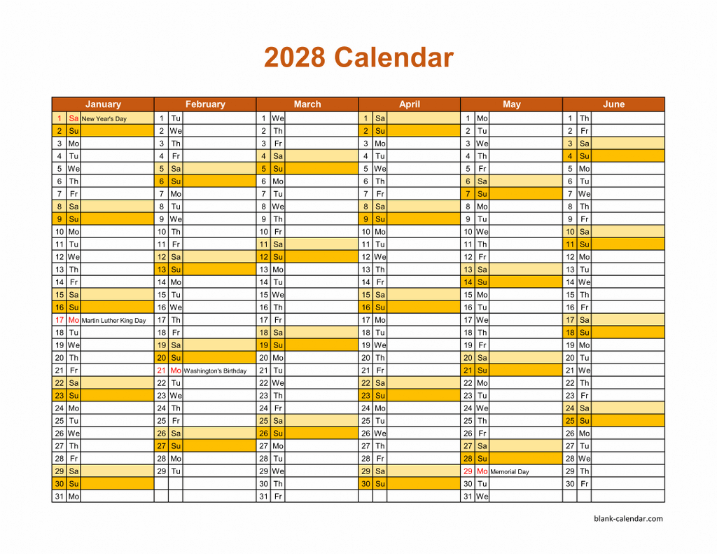Free Download Printable Calendar 2028, month in a column, half a year per page Free Download Printable Calendar 2028, month in a column (two pages, half a year per page, horizontal) Version: 2027 - 2028Week starts on Sunday Week starts on Monday Total Downloads: > 1,000 times ➤ See All Printable 2028 Calendars Related Printable 2028 CalendarsPrintable Calendar 2028 with check boxes (12 pages, one month per page, horizontal)Printable Calendar 2028, large box grid, space for notes (one month per page, horizontal)Printable Calendar 2028, 2 months per page, 6 pages (vertical)Printable Calendar 2028 with US Federal Holidays (one page, horizontal)Printable Calendar 2028, large space for appointment and notes (12 pages, horizontal)